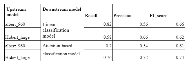 Looking at inference results of the end-to-end solution, it’s claimed that using speech features, instead of text, with fine-tuned downsample models led to more meaningful results. Namely, the combination of HuBERT and an attention-based model shows the most concise result among all approaches. In this case, classifiers learned to catch relevant information that could help differentiate between healthy people and those with Dementia.