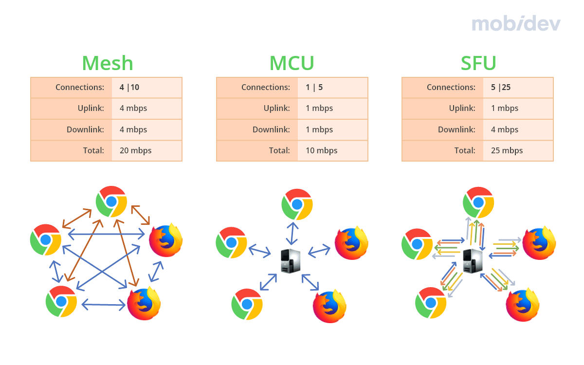 WebRTC protocol is used for video conferencing apps like Zoom and Google Meet, and there are three network organization types for group calls in video conferencing systems, which determine the quality and functionality of group calls.