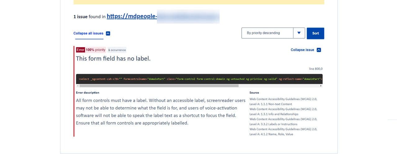 Axe DevTools is an extension available for Chrome and Firefox. It’s free and lightweight and intended for testing whole pages or their parts. Accessibility issues here are graded according to their severity, while code snippets facilitate debugging. Compared to other tools, Axe DevTools helps to spot more issues because of the Intelligent Guided Tests feature which identifies areas to be tested. Axe-core is the crucial component under the hood of Axe DevTools. That’s why you are supposed to use Axe DevTools separately from tools with a similar tech stack, to avoid double-scanning.