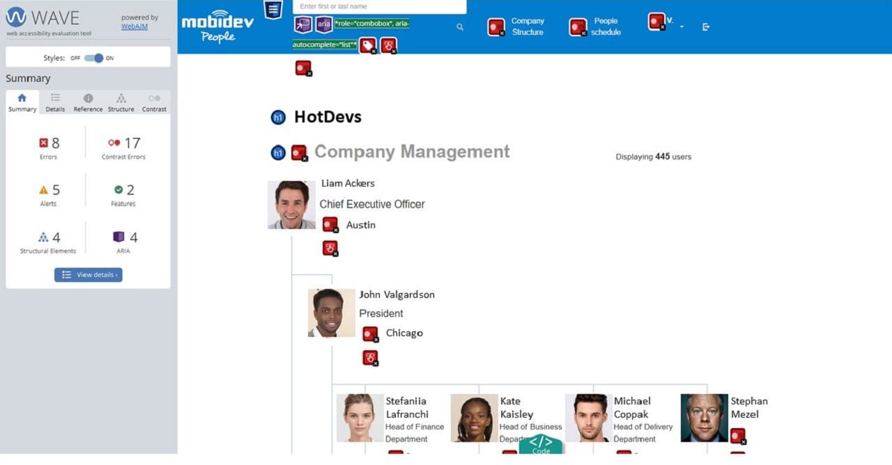 The MobiDev team was supposed to check web accessibility of the HR portal & automated employee management system. This solution represents a corporate social network with company structure. We decided to perform web accessibility testing using the most popular testing tools, and then evaluate the outcomes.