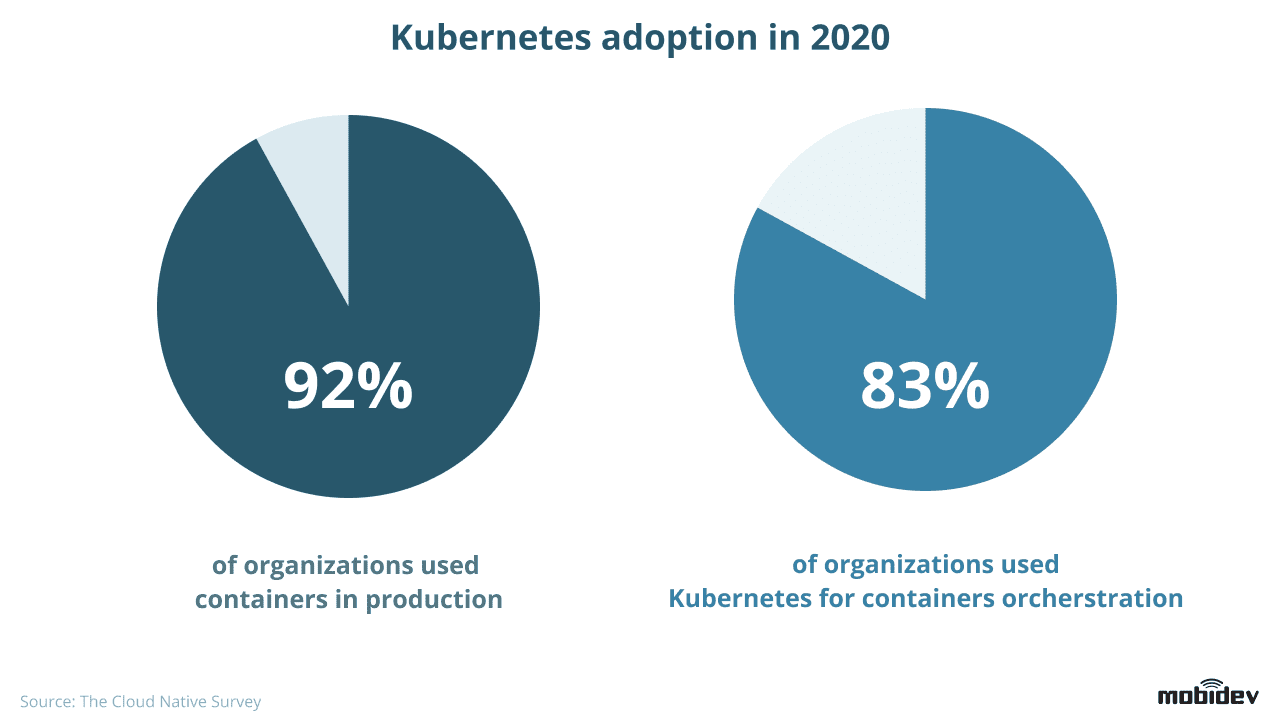 The Cloud Native Survey, which polls Technology/Software organizations, reports that the use of containers in productions has increased by 84% from the previous year, up to 92%. Use of Kubernetes is up 78% from the previous year, reaching 83%.
